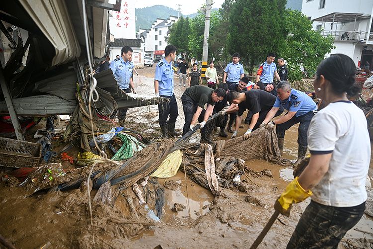 6月21日,公安民警在黄山市歙县绍濂乡协助群众对受灾房屋进行清理疏通。当地公安、民兵以及志愿者队伍也在源源不断向小溪村挺进。“孤岛”再也不“孤单”。