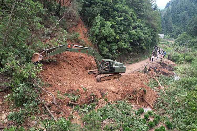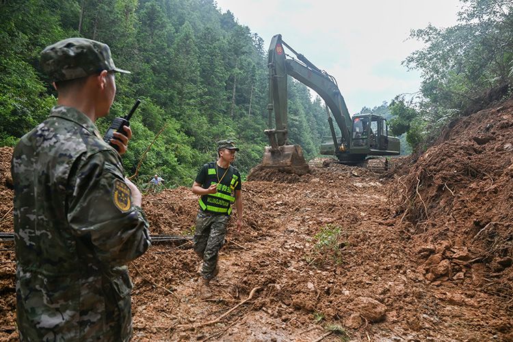 6月21日下午,武警第二机动总队某支队抢险人员正在对歙县绍濂乡进入小溪村的塌方路段进行清理疏通。打通道路后,进入受灾严重地区。