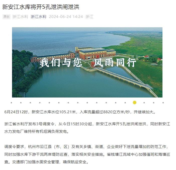 浙江省水利厅发布3号调度令,从今日15时30分起,新安江水库开5孔泄洪闸泄洪,同时新安江水力发电厂维持所有机组满负荷发电。