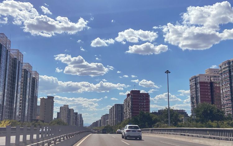 广渠路,城市上空蓝天白云。