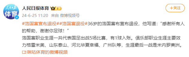 据人民日报体育微博消息,36岁的洛国富布宣布退役,他写道:“感谢所有人的帮助,谢谢你足球!”