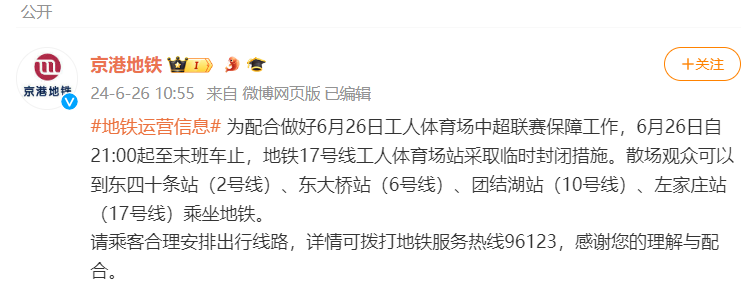 新京报讯 据@京港地铁 消息,为配合做好6月26日工人体育场中超联赛保障工作,6月26日自21:00起至末班车止,地铁17号线工人体育场站采取临时封闭措施。散场观众可以到东四十条站(2号线)、东大桥站(6号线)、团结湖站(10号线)、左家庄站(17号线)乘坐地铁。