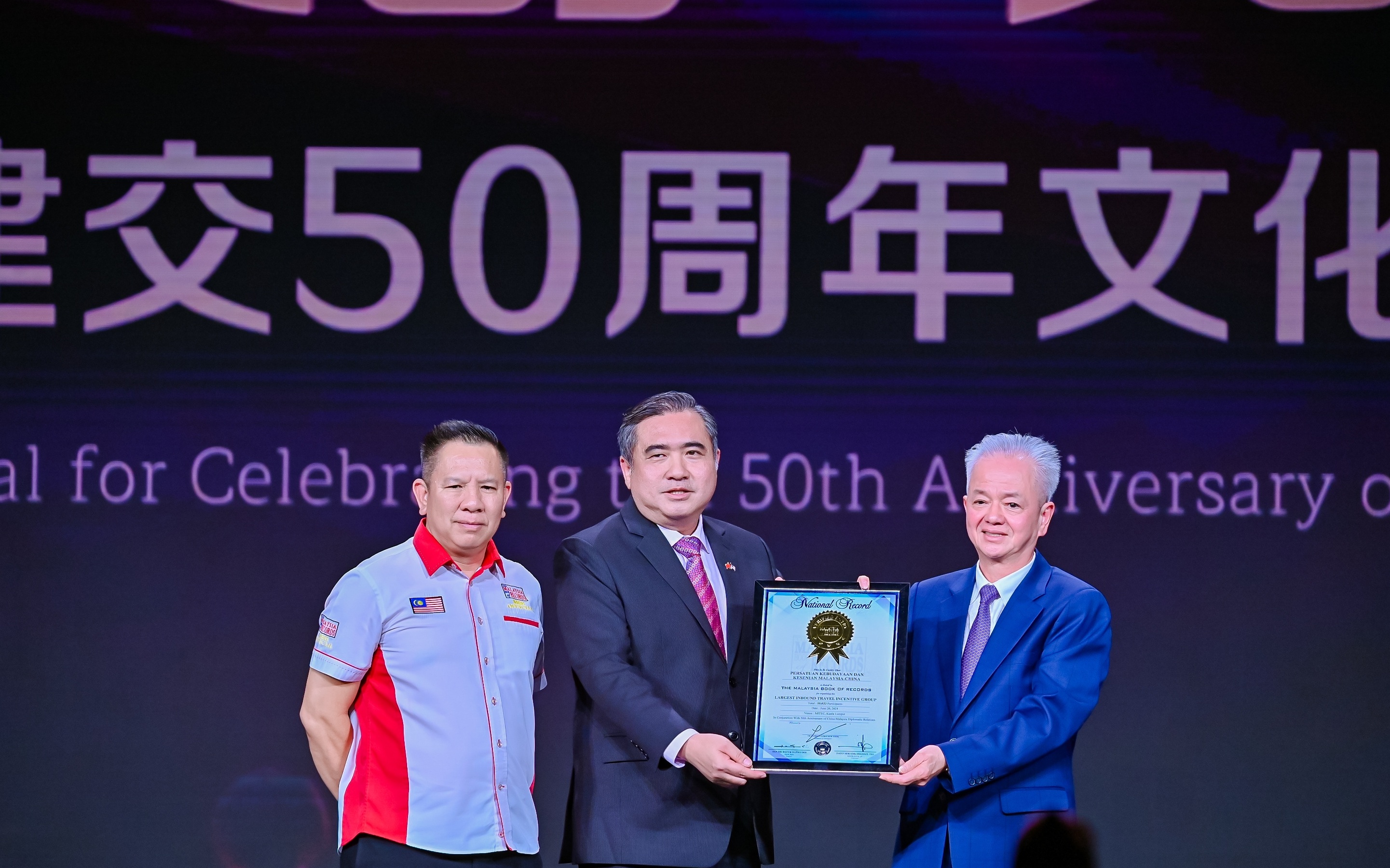 盛典上,陆兆福颁发马来西亚纪录大全“马中建交50周年纪念入境团队人数最多纪录”。