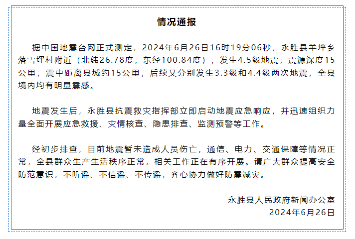 新京报讯 据今日永胜官微消息,据中国地震台网正式测定,2024年6月26日16时19分06秒,永胜县羊坪乡落雪坪村附近(北纬26.78度,东经100.84度),发生4.5级地震,震源深度15公里,震中距离县城约15公里,后续又分别发生3.3级和4.4级两次地震,全县境内均有明显震感。