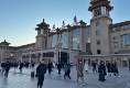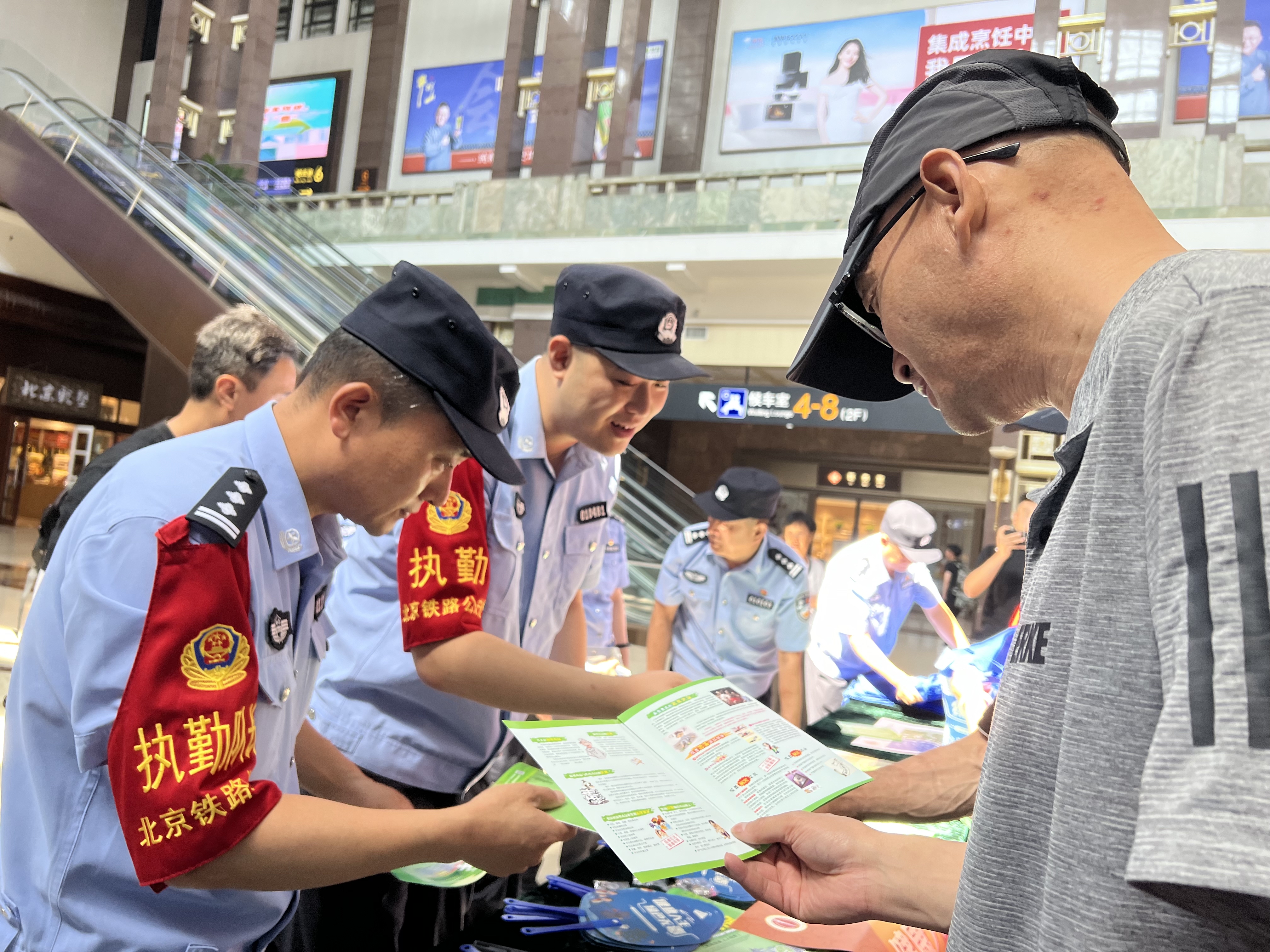 北京站内,民警在给过往旅客发放宣传手册。 图源:北京铁警