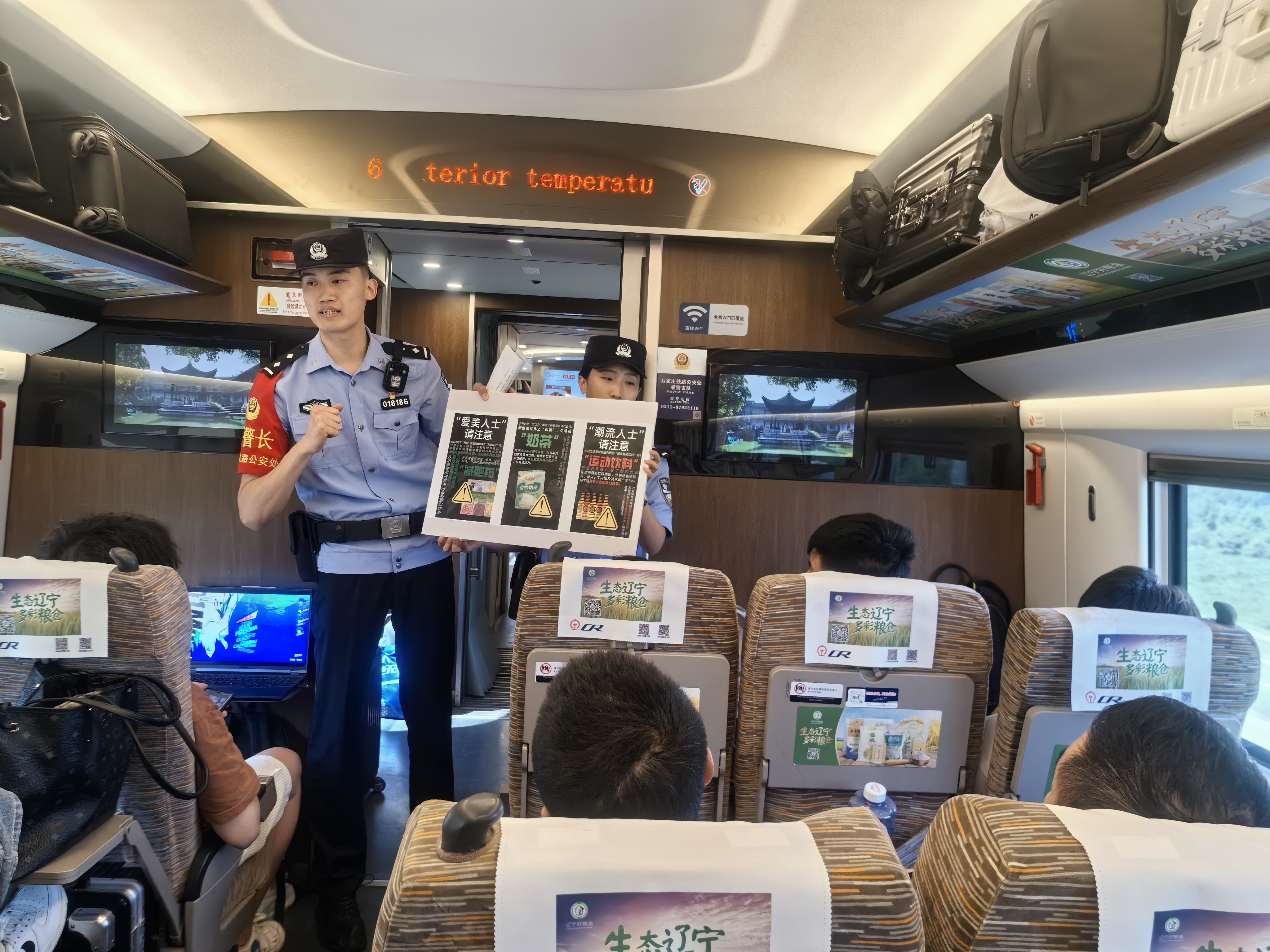 乘警在列车上给旅客介绍禁毒常识。 图源:北京铁警