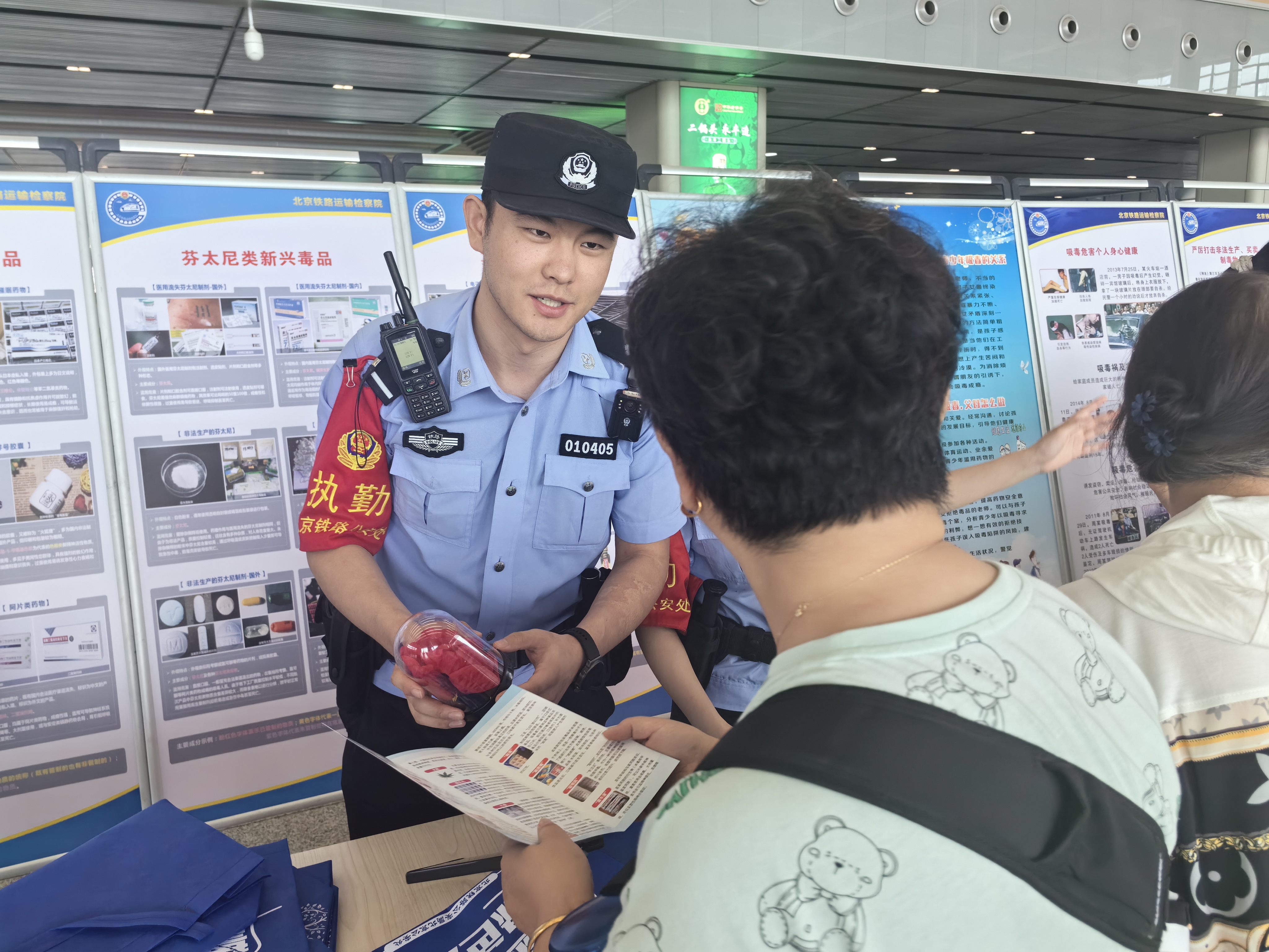 新京报讯(记者张静姝 通讯员王海蛟 郁佳琪) 6月26日,新京报记者从北京铁路公安处获悉,在第37个国际禁毒宣传日到来之际,北京铁路警方携手北京铁路运输检察院、丰台区戒毒所、北京丰台站地区管理办公室、北京站、北京丰台站、北京客运段等单位分别在北京站、北京丰台站和G93次列车上开展了“国际禁毒日”宣传活动。据悉,此次宣传活动的主题是“防范青少年药物滥用”,通过宣传教育,提醒广大青少年树立“健康人生、绿色无毒”理念。