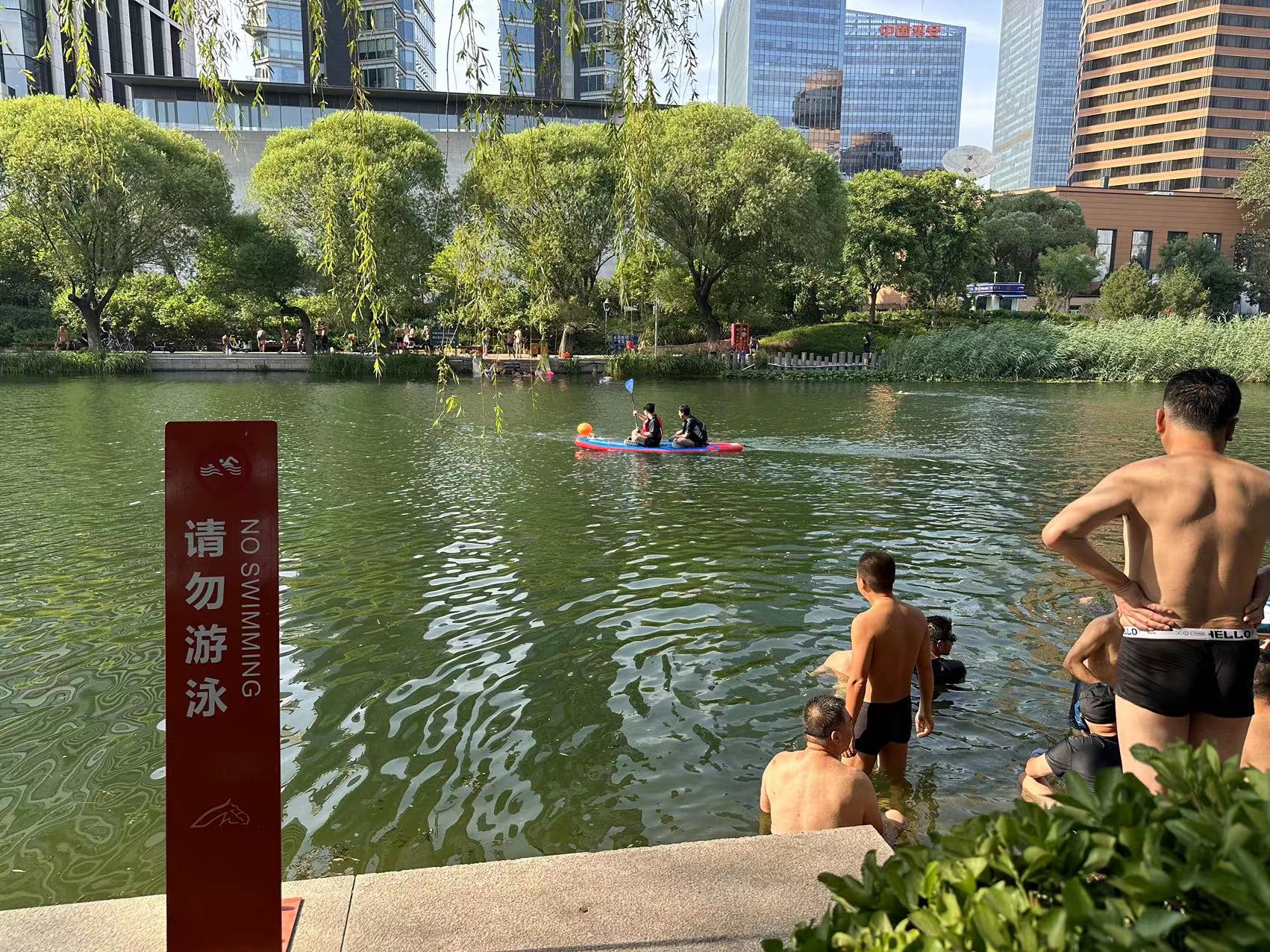 6月26日下午,新京报记者注意到,亮马河燕莎桥附近南岸设有“请勿游泳”标志,但仍有不少人在此游泳。 新京报记者 慕宏举 摄