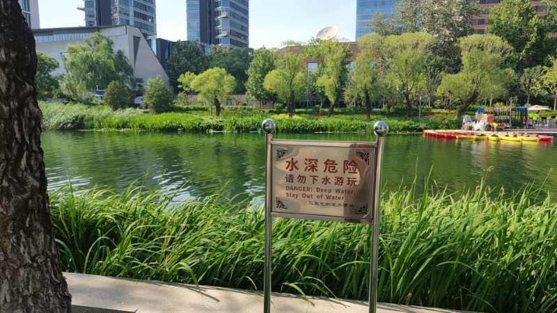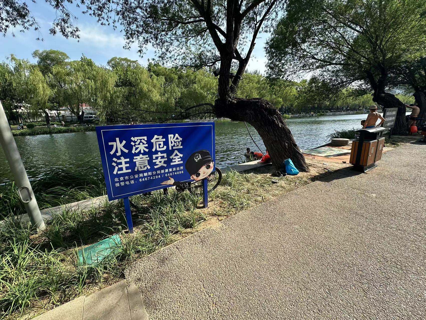 亮马河涉事河段南岸的保安人员告诉新京报记者,虽然南岸有“请勿游泳”的标识,但平日总有很多人下水。北岸的保安人员也表示,河内淤泥、水草多,河水深3到4米,有一定危险性。他呼吁,群众不要下河游泳。