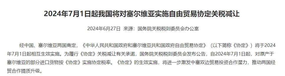 新京报讯 据财政部消息,经中国、塞尔维亚两国商定,《中华人民共和国政府和塞尔维亚共和国政府自由贸易协定》(以下简称《协定》)将于2024年7月1日起相互生效实施。为履行《协定》关税减让有关承诺,国务院关税税则委员会发布公告,自2024年7月1日起,对原产于塞尔维亚的部分进口货物按《协定》实施协定税率。《协定》的生效实施,将进一步激发中塞双边贸易投资合作潜力,推动两国经贸合作提质升级。