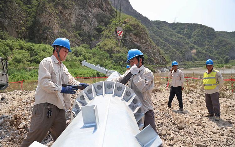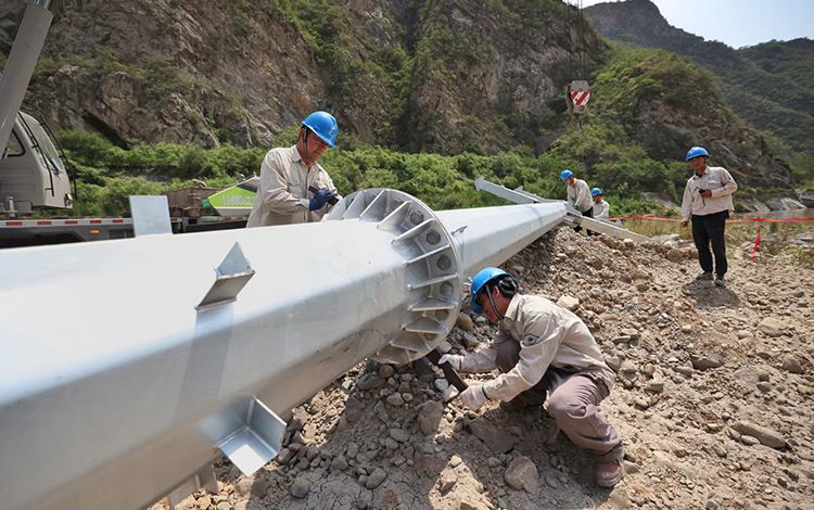 6月27日,在北京市门头沟区妙峰山镇下苇甸村附近,一根根银色的电力钢杆完成组立。在灾后重建中,门头沟区已累计完成1100棵电杆组立、19台变压器组装及30公里导线架设工作。