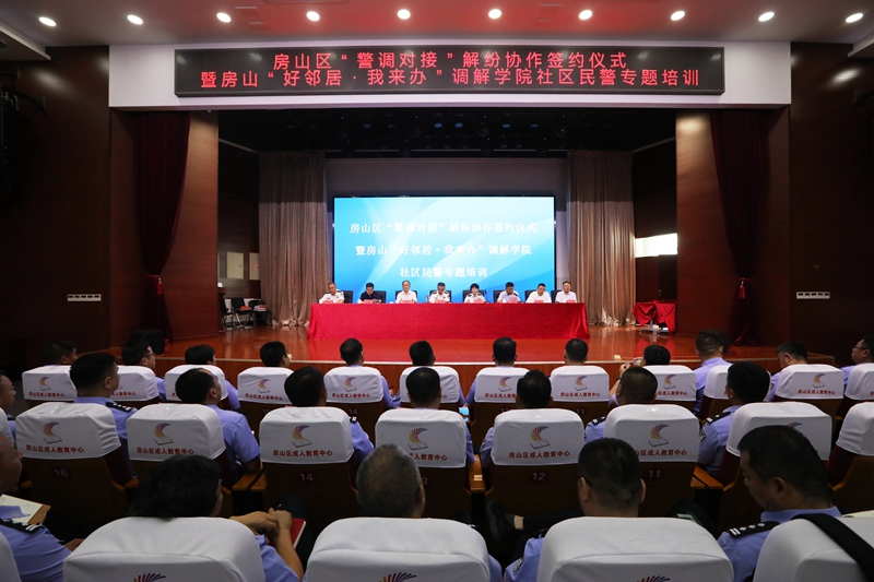 新京报讯(记者张静姝)6月26日,北京市公安局房山分局与区司法局共同举行“警调对接”解纷协作机制签约仪式,同时举行房山“好邻居·我来办”调解学院社区民警专题培训,助推基层社会治理创新,维护和促进社会和谐稳定。