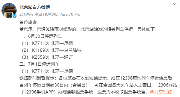 新京报讯 据北京站官方微博消息,受京承、京通线降雨封线影响,北京站始发的相关列车停运,具体如下:
