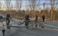 西红门特勤站的消防救援人员用水带喷水,确保可燃物不再复燃。图源:大兴区消防救援支队