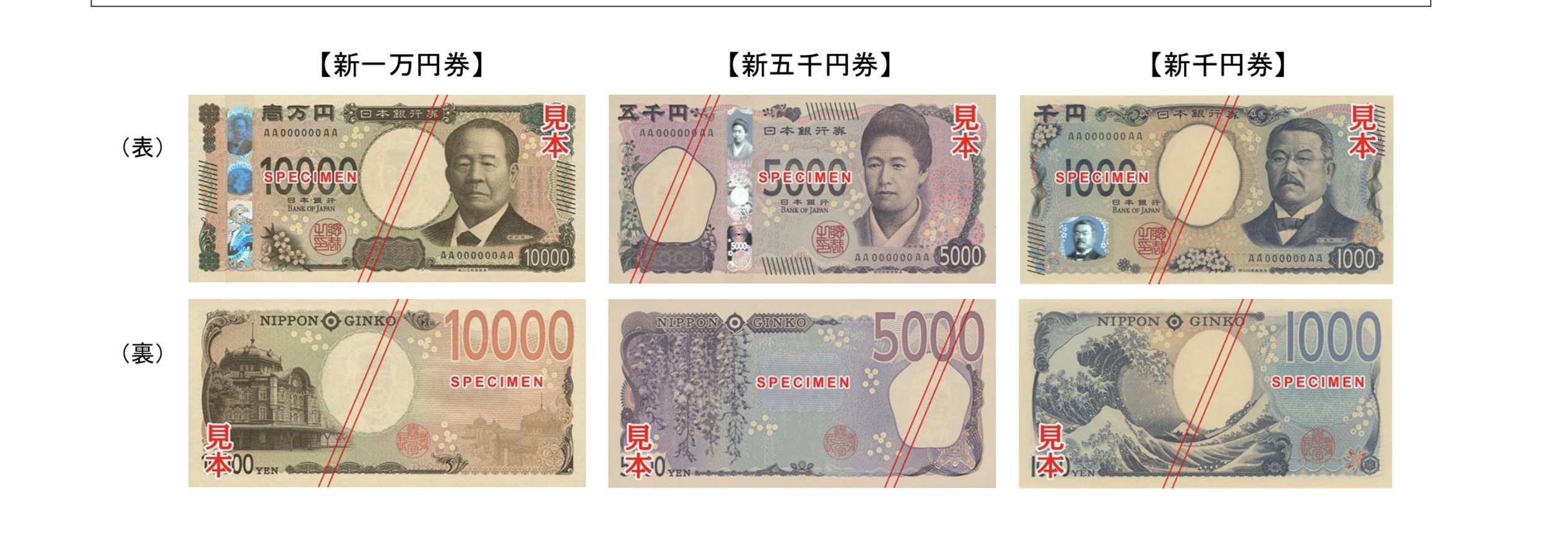 币面设计均进行更换,新版一万日元印有被称为“近代日本经济之父”的涩泽荣一,新版五千日元印有日本近代女子教育家津田梅子,新版一千日元印有日本近代医学家北里柴三郎。