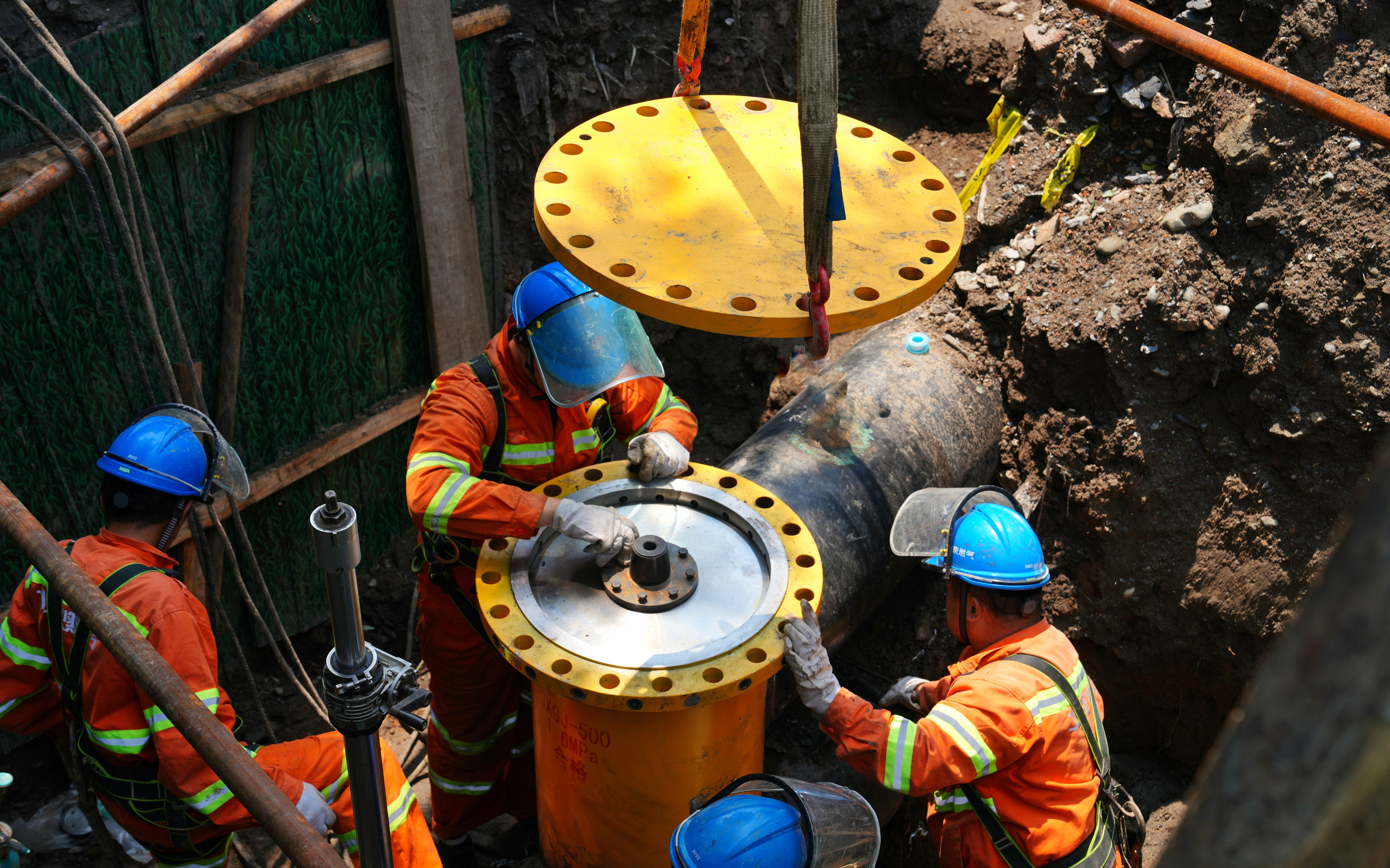房山区河北镇中压天然气工程通气作业的施工现场。北京燃气集团供图