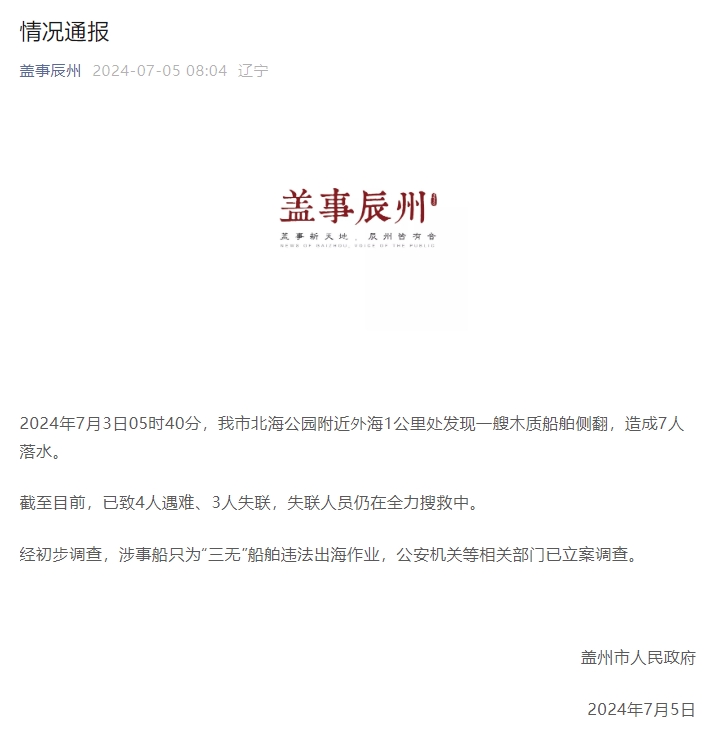 新京报讯 7月5日,辽宁盖州市人民政府发布情况通报:2024年7月3日5时40分,盖州市北海公园附近外海1公里处发现一艘木质船舶侧翻,造成7人落水。