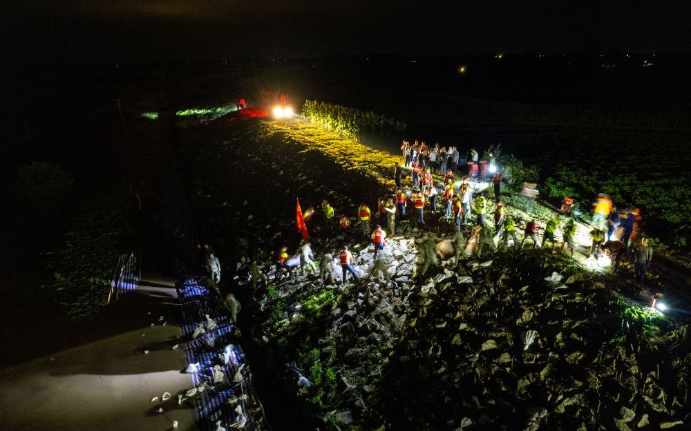 22时40分,消防队员的头灯、巡堤人员的手电筒、运送沙袋的卡车车灯……大堤上星火攒动。这是一个注定忙碌又紧张的夜晚。(记者周楠、阮周围、谢奔)