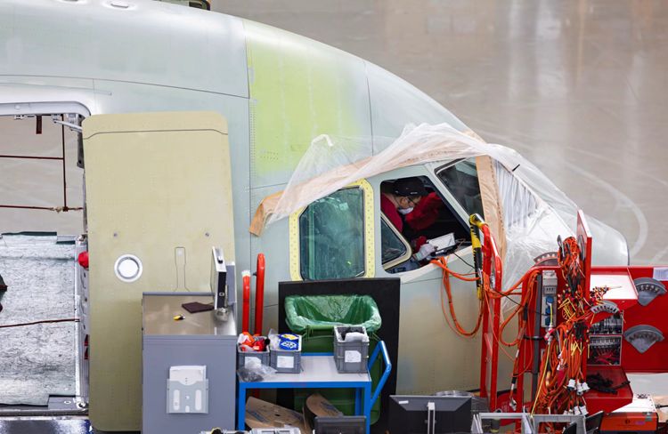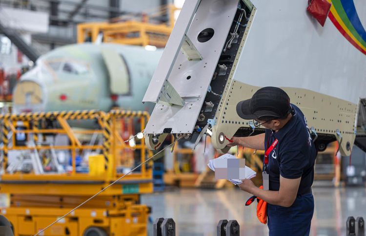 安装飞机垂直尾翼前,工作人员仔细检查垂直尾翼零部件。