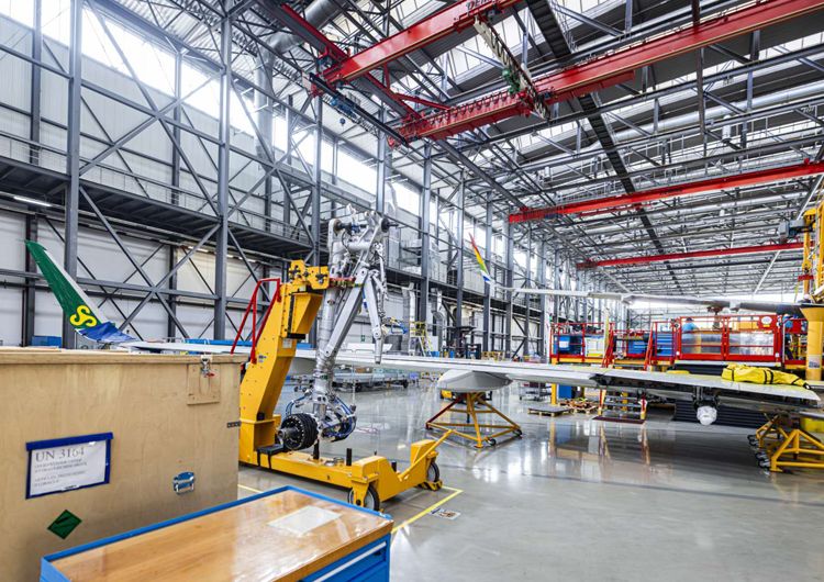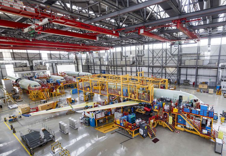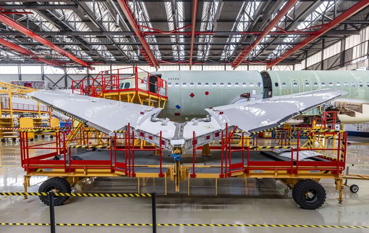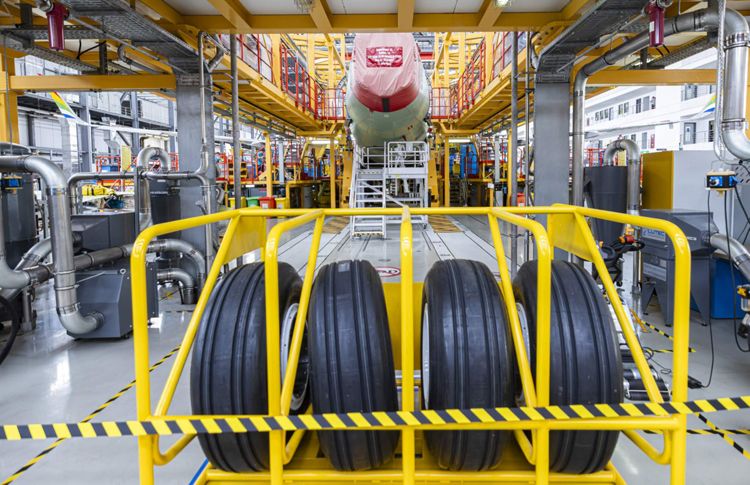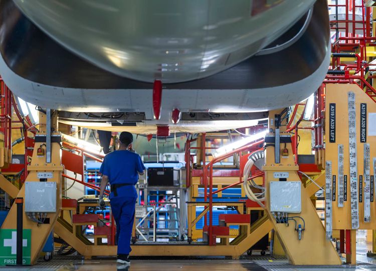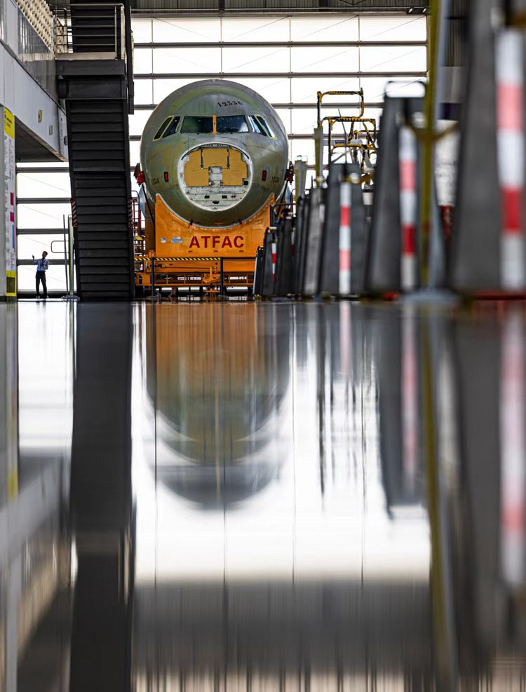 工作人员检查飞机下方的起落架安装区域。2021年11月,空客宣布与中方合作伙伴签署协议,计划将总装线生产能力扩展至A321飞机。2023年3月,首架A321飞机交付吉祥航空。同年4月,空客与天津保税区投资有限公司、中国航空工业集团有限公司签署协议,建设第二条生产线,拓展总装能力。
