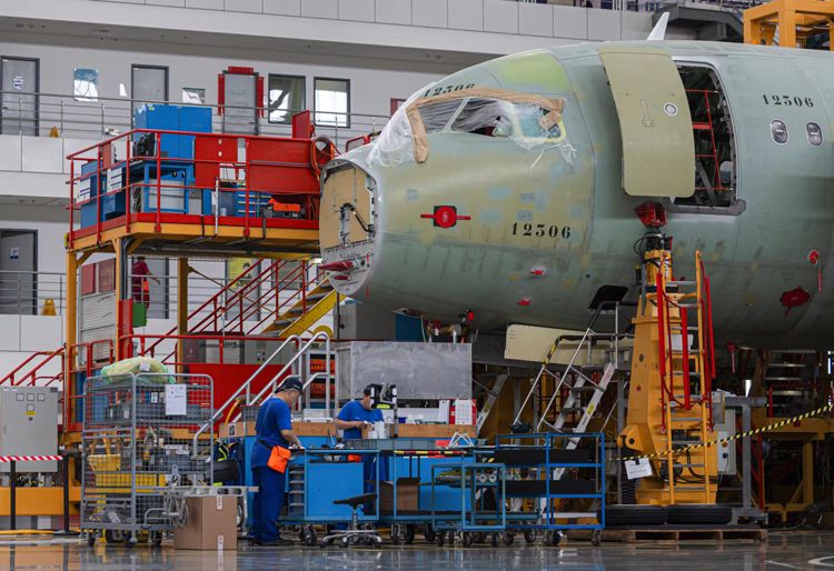 7月9日,空客天津总装线,工作人员在飞机驾驶舱内工作。空客天津总装线于2008年投入运营,2009年交付首架飞机后,其一期合作达成月产4架的成果,每年交付48至50架飞机。2016年4月,二期合作延长至2025年,并增加 A320neo系列飞机总装任务,开始向亚洲航空公司交付飞机。2024年7月8日,空客天津总装线完成第700架飞机交付客户。7月9日,记者探访了这一神秘而繁忙的总装线。