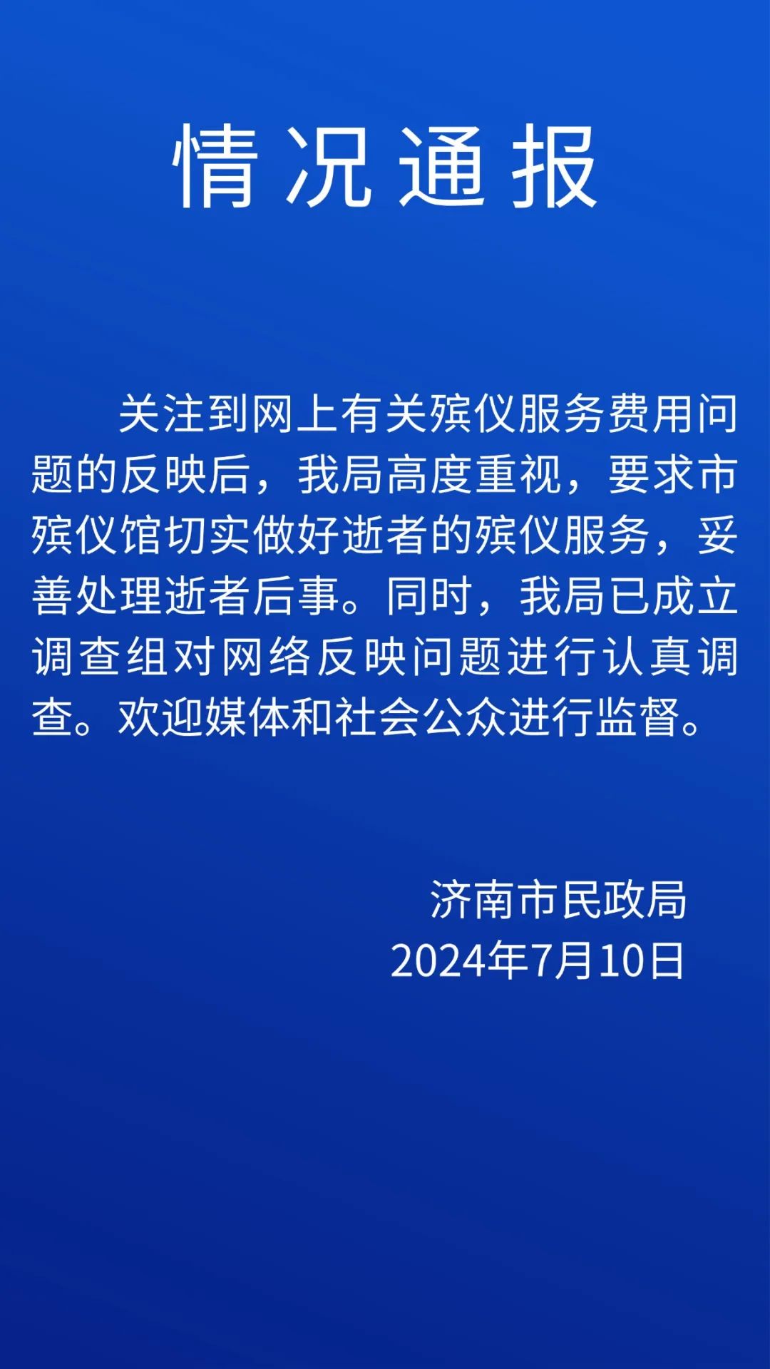 新京报讯 7月10日,济南市民政局发布情况通报,称已关注到网上有关殡仪服务费用问题的反映,目前已成立调查组调查。