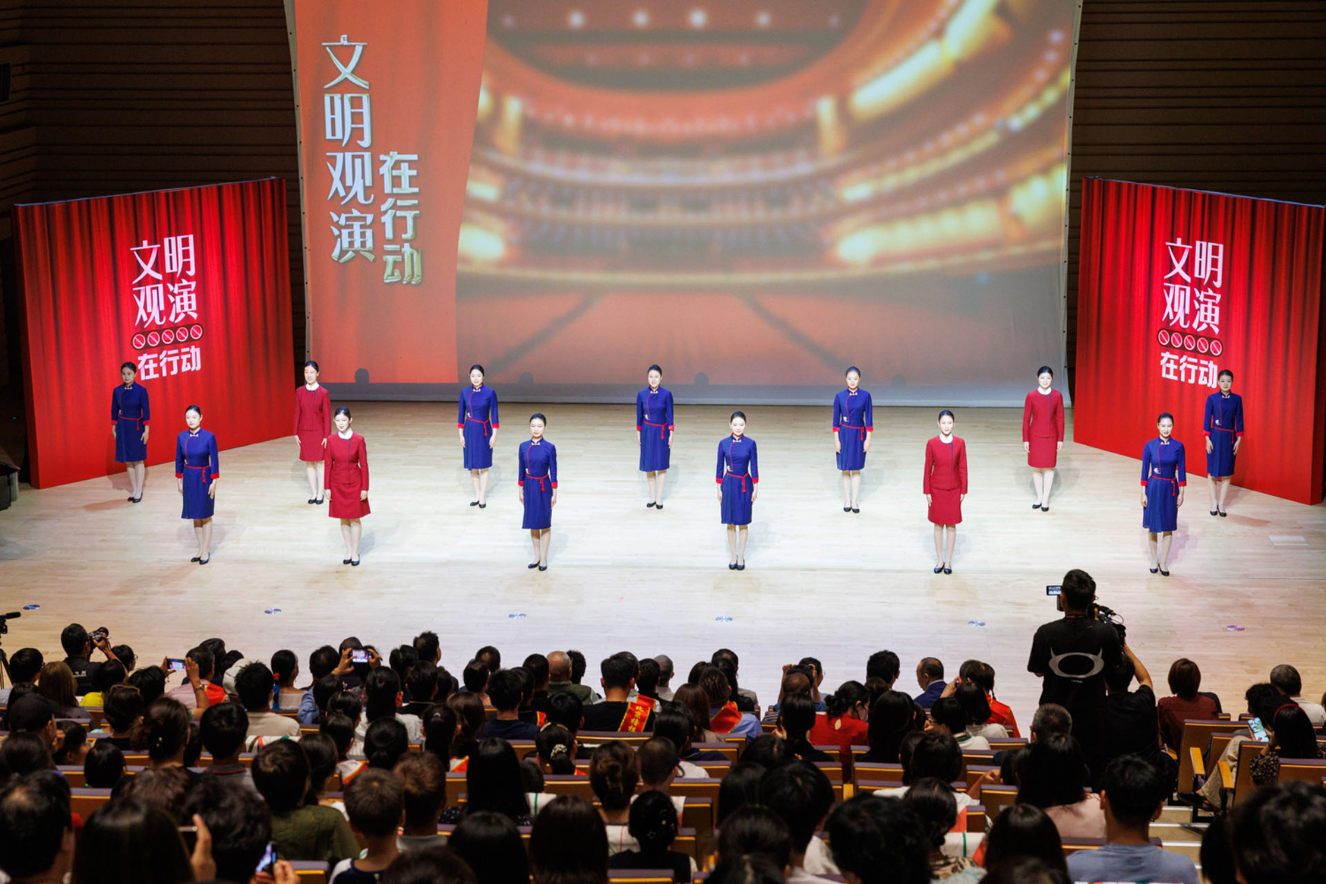 国家大剧院剧场服务人员为观众带来文明观演礼仪展示。