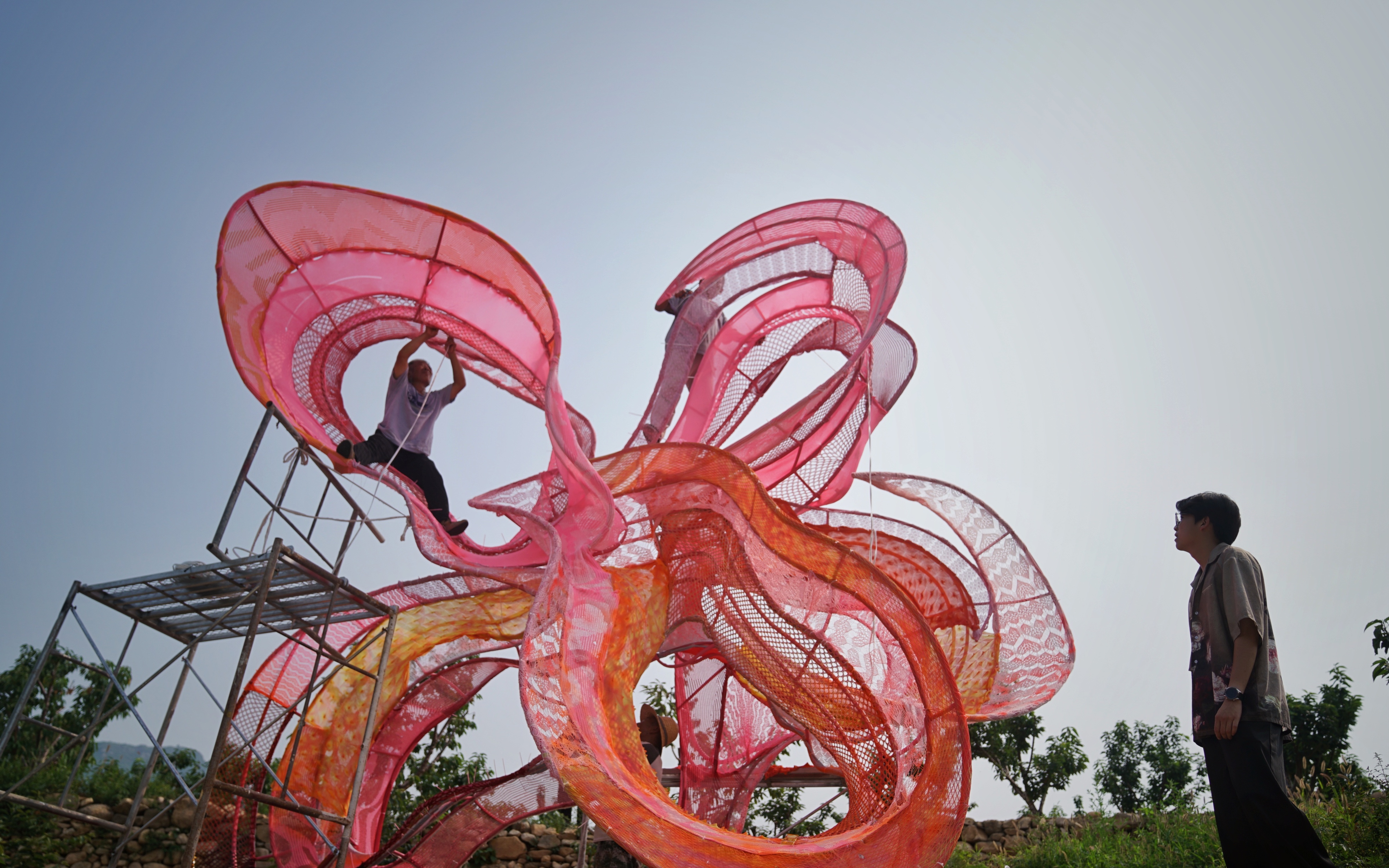 7月11日,平谷区南山村,工作人员对一件艺术装置进行最后的调整。新京报记者 薛珺 摄