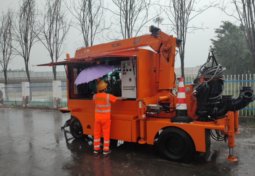 首发养护抢险人员正在检查移动泵站。首发养护供图