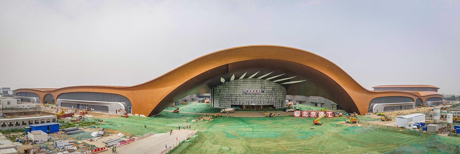 东登录厅全景(图片为全景拼接)。东登录厅是整个项目建设规模最大、施工难度最高的建筑,其大厅拉索幕墙钢结构曲面造型独特,像是一张拉满弦的“朝天弓”。