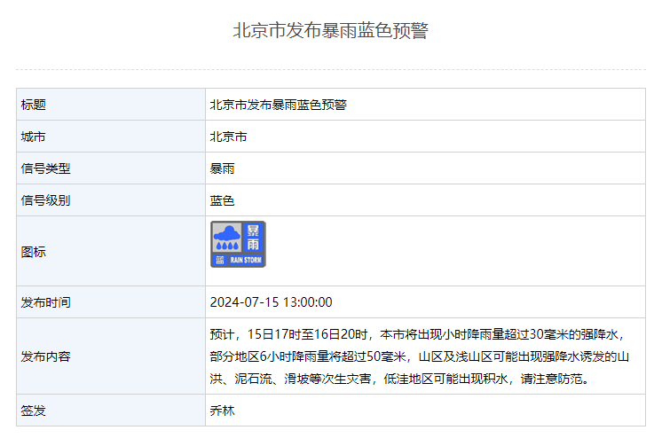 北京发布暴雨蓝色预警 将出现小时降雨量超30毫米的强降水