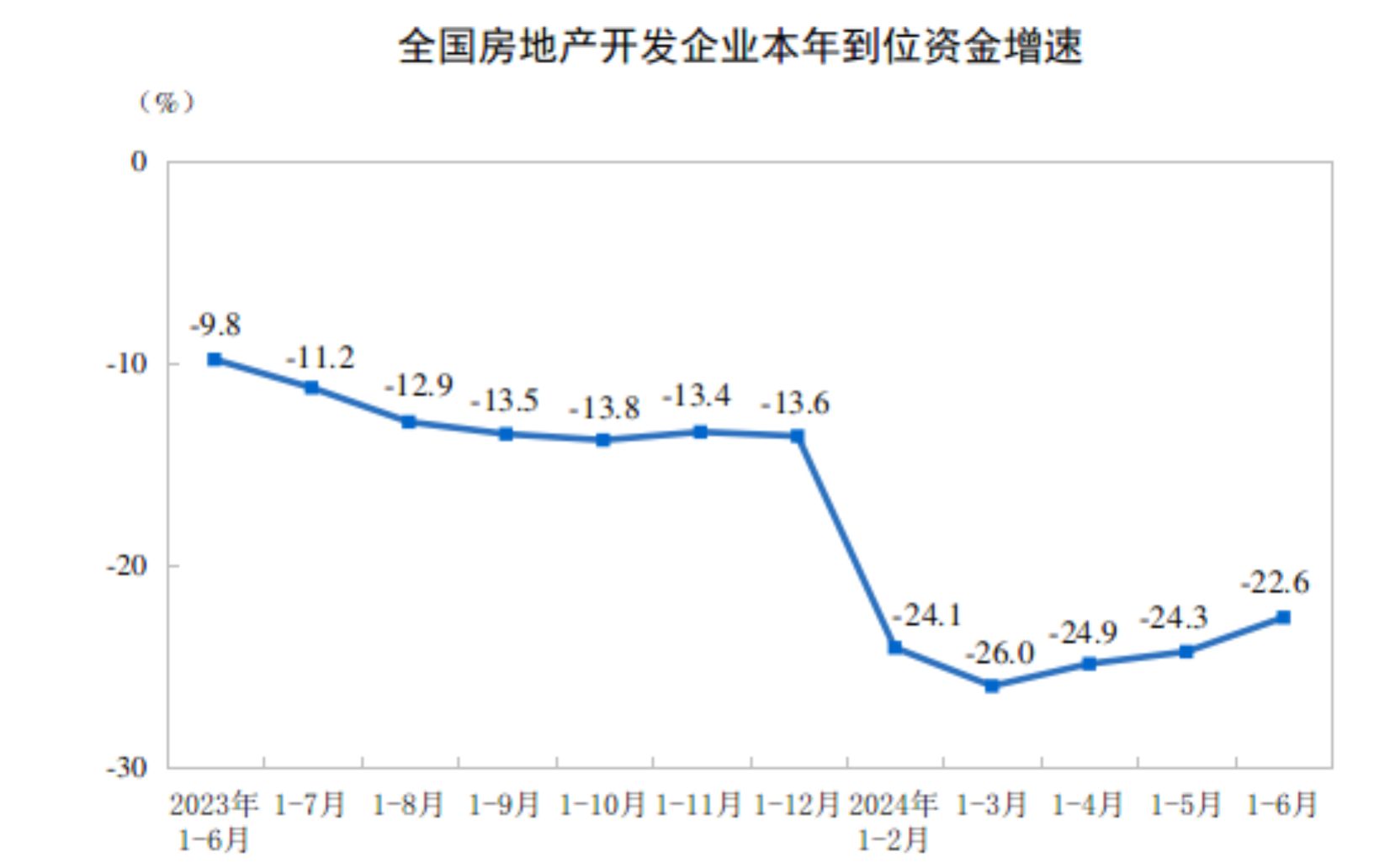 1-6月份,房地产开发企业到位资金53538亿元,同比下降22.6%,降幅较1-5月份(-24.3%)收窄1.7个百分点,累计创下年内最小降幅。