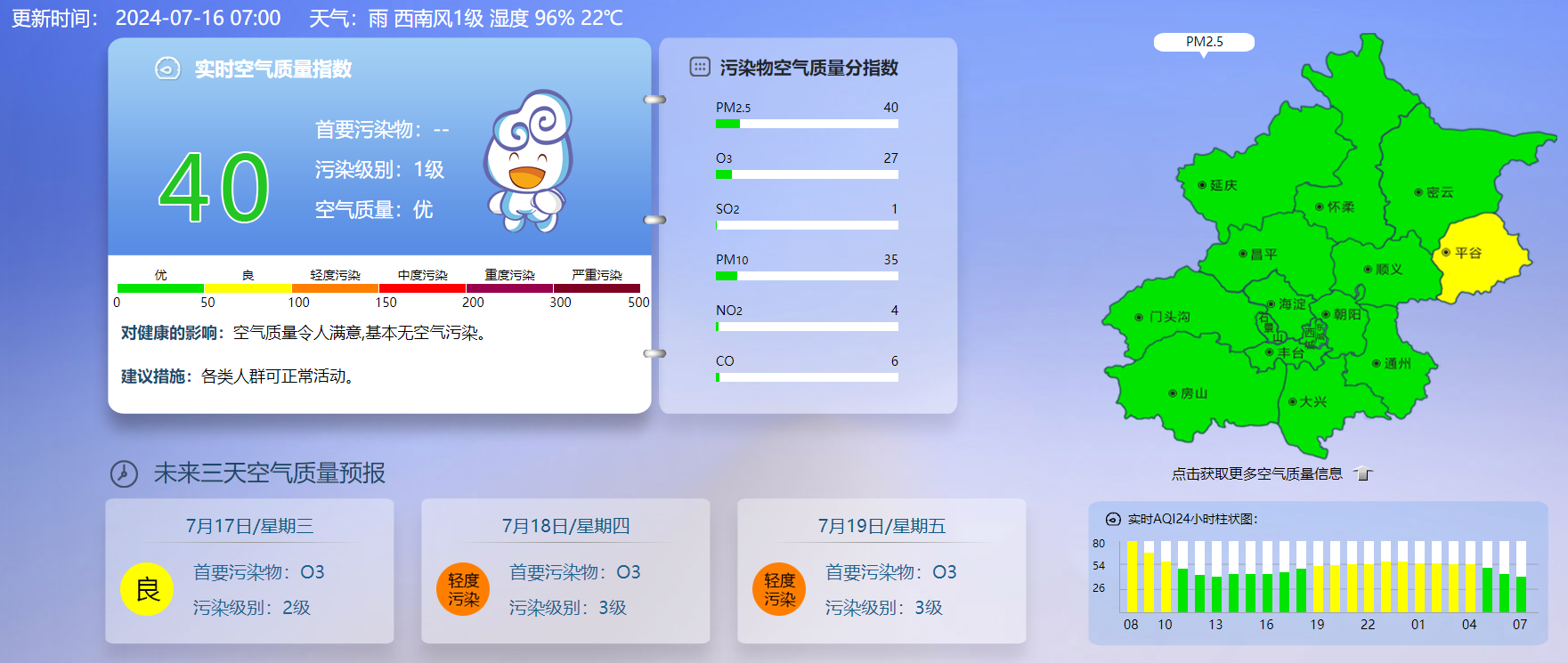 据北京市生态环境监测中心今早7时数据,目前实时空气质量指数40,污染级别1级,空气质量优。