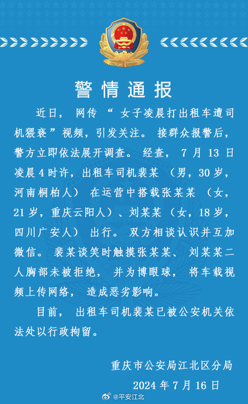新京报讯 据@平安江北微博通报,近日, 网传“女子凌晨打出租车遭司机猥亵”视频,引发关注。 接群众报警后,警方立即依法展开调查。经查,7月13日凌晨4时许,出租车司机裴某 (男,30岁,河南桐柏人) 在运营中搭载张某某 (女,21岁,重庆云阳人)、刘某某 (女,18岁,四川广安人) 出行。双方相谈认识并互加微信。裴某谈笑时触摸张某某、刘某某二人胸部未被拒绝,并为博眼球,将车载视频上传网络,造成恶劣影响。目前,出租车司机裴某已被公安机关依法处以行政拘留。