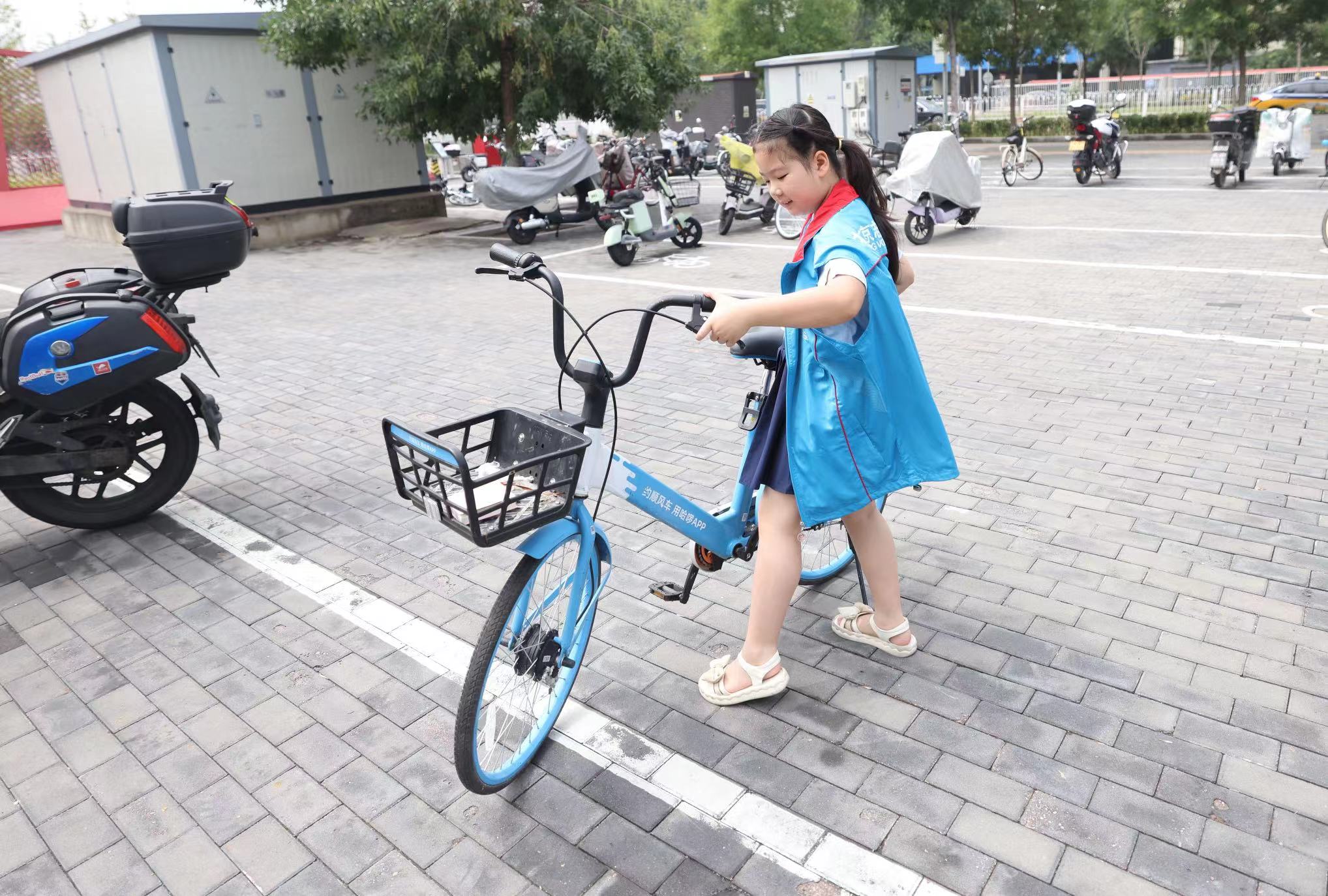 一位小朋友抬起共享单车码放入位。