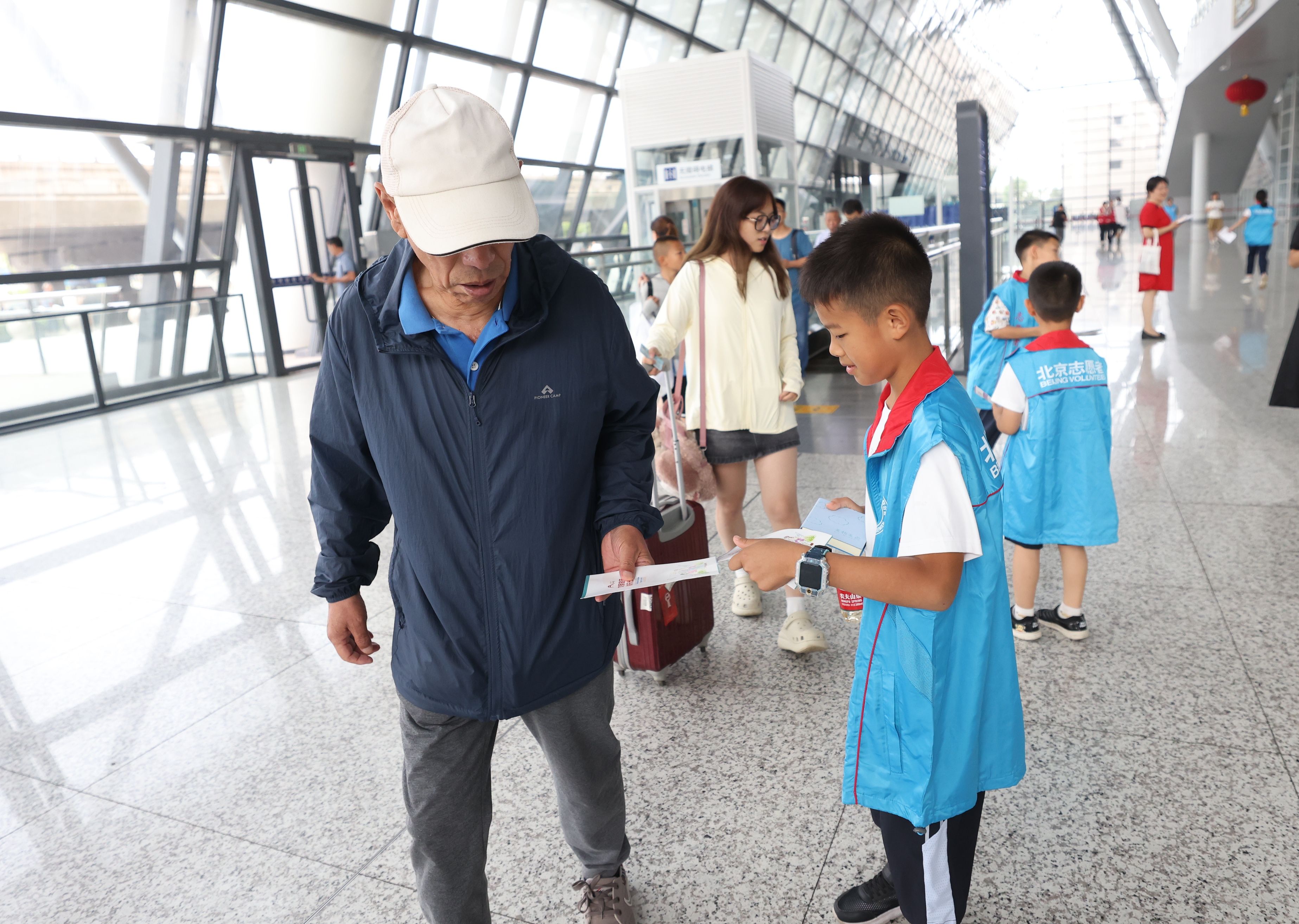 小朋友们穿上志愿者马甲向过往旅客发放文明宣传单。通过设置文化场景、安全场景、文明场景、志愿场景闯关互动,清河站办在综合服务大厅、高铁进站口、出租车调度站等多处打卡点为孩子们准备了学习“大礼包”和志愿服务活动。