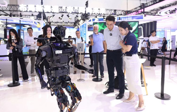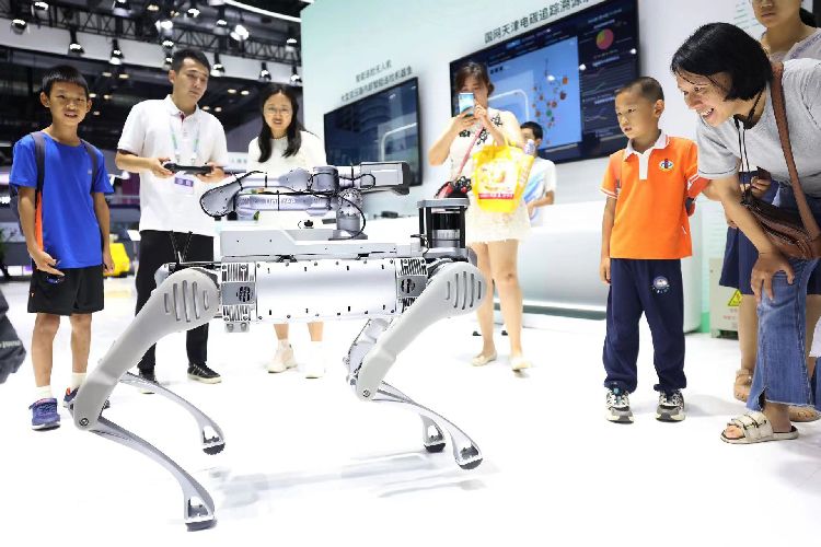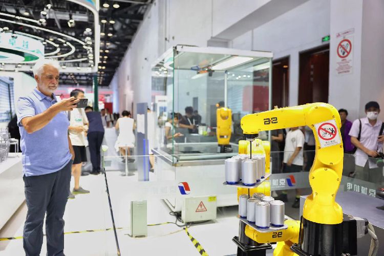 7月16日下午,第二十六届中国北京国际科技产业博览会圆满落幕。本届北京科博会年度主题为“实施创新驱动发展战略 增强高质量发展动能”,线上线下同步开展。4天展期中接待境内外各界观众6万余人次,线上磋商对接11000余人次。图为观众观看人形机器人。