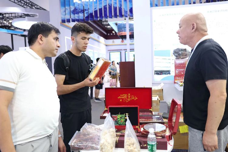 7月16日,吉林省展区,工作人员向外国观众介绍吉林特产。本届北京科博会举办了32场贸易投资促进活动,现场签订合作协议41项。组织“中国—东盟科技产业投资贸易洽商会”“‘未来产业’系列推介发布活动”“北京医药健康、新能源产业招商推介交流会”等活动,助力企业精准对接。
