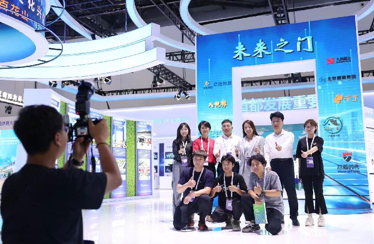 7月16日,门头沟展区,工作人员合影留念。本届北京科博会突出科技产业交流合作和国际贸易投资促进两大功能,进一步促进了创新链、产业链、资金链、人才链高效聚合,为北京推进国际科技创新中心建设、营造具有全球竞争力的开放创新生态注入新动能。