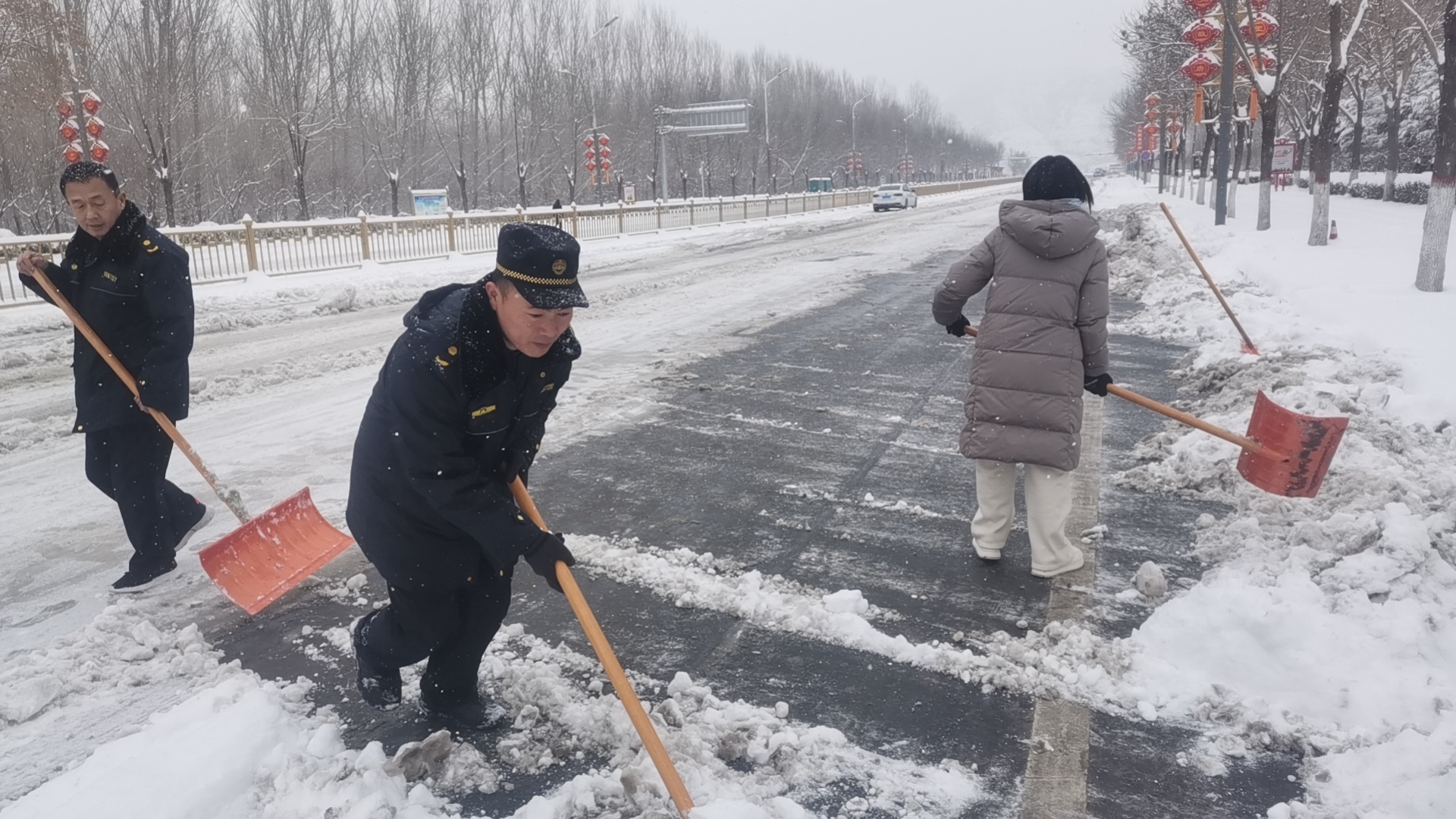2024年2月21日,唐县下大雪,石智安(左二)在清理路面积雪。 受访者供图