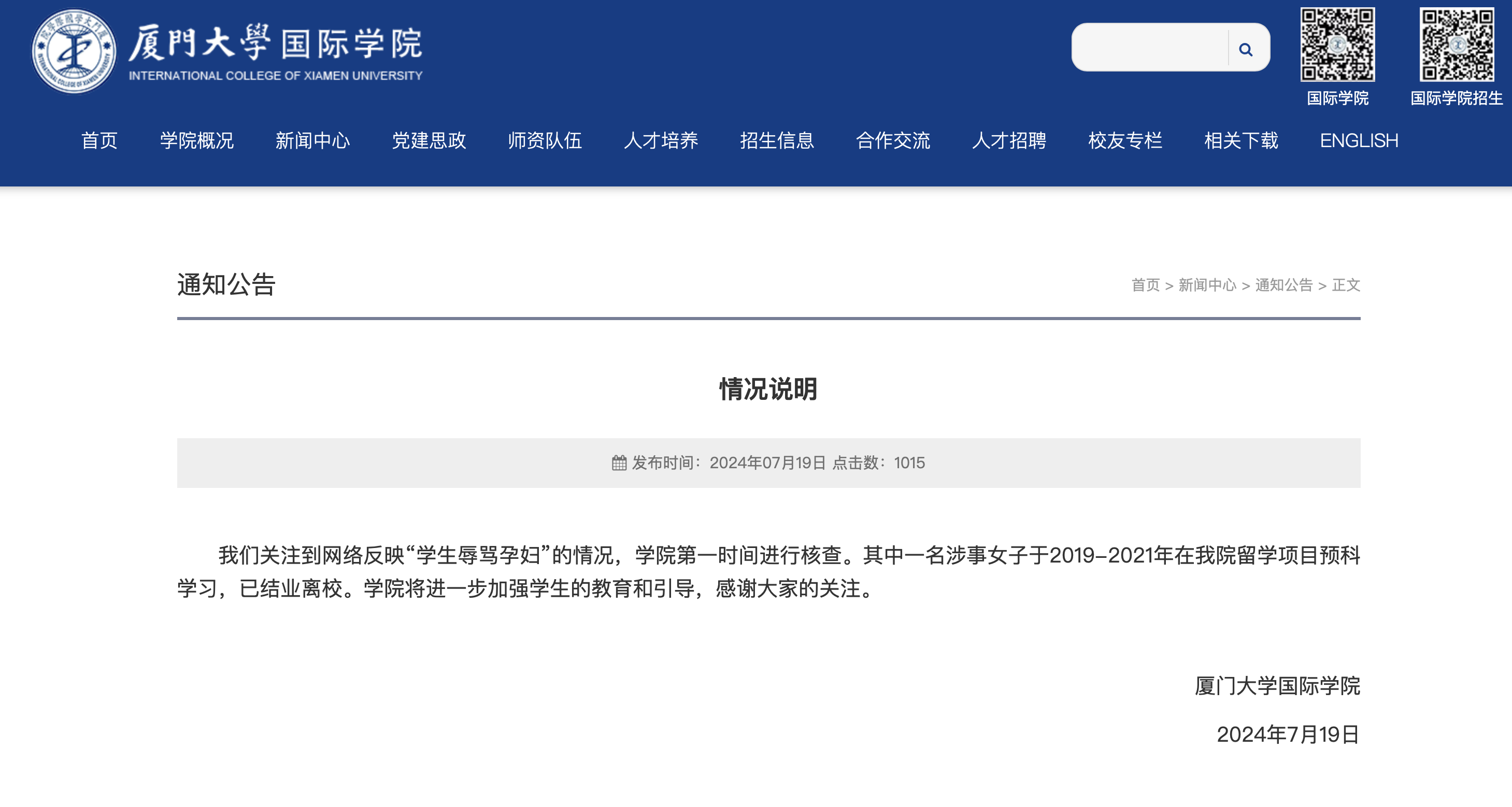新京报讯 7月19日,厦门大学国际学院发布情况说明:厦门大学国际学院关注到网络反映“学生辱骂孕妇”的情况,学院第一时间进行核查。其中一名涉事女子于2019-2021年在厦门大学国际学院留学项目预科学习,已结业离校。学院将进一步加强学生的教育和引导,感谢大家的关注。