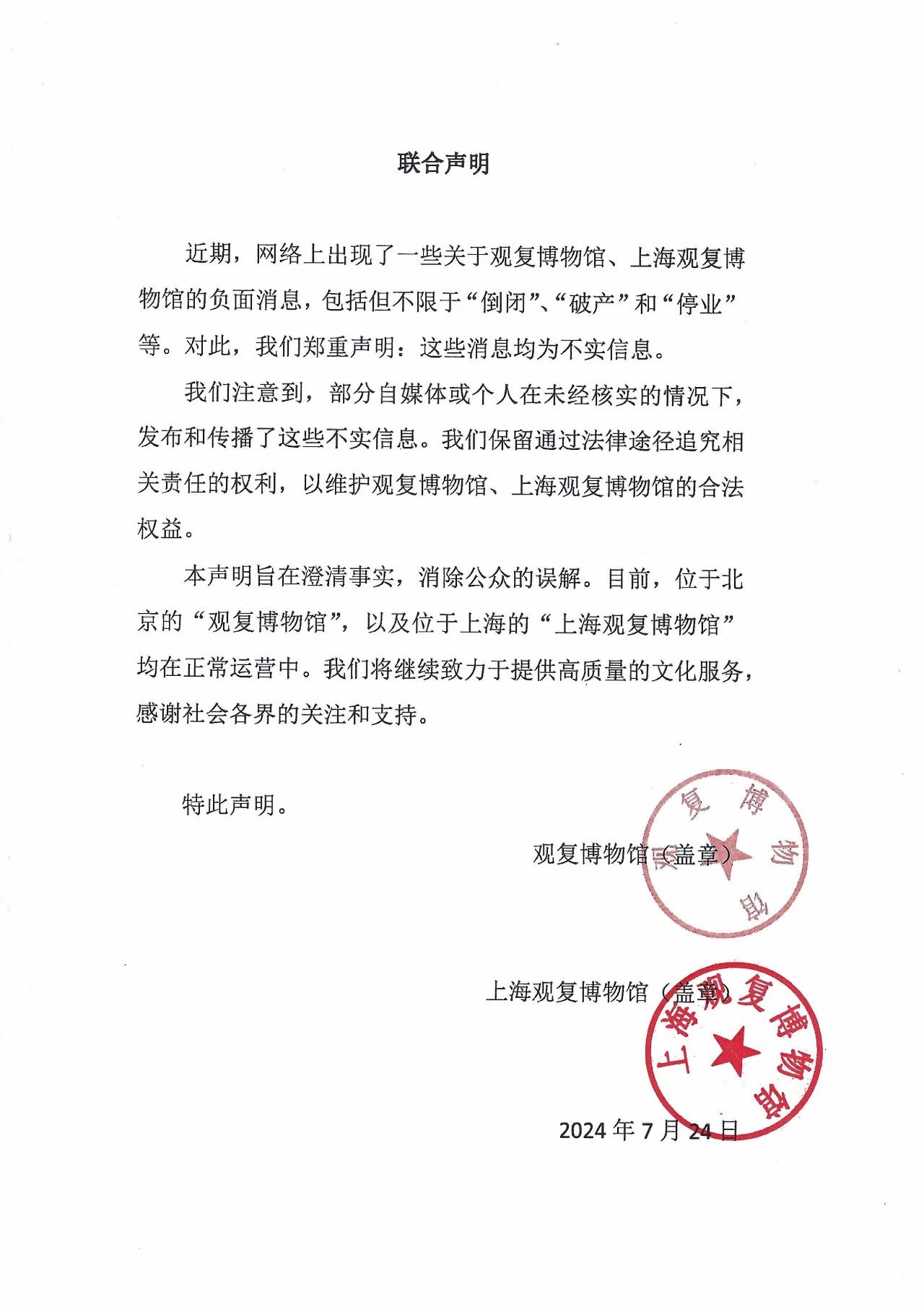 新京报讯(记者展圣洁)7月24日9时,观复博物馆微信公众号发表声明称:近期,网络上出现了一些关于观复博物馆、上海观复博物馆的负面消息,包括但不限于“倒闭”“破产”和“停业”等。“对此,我们郑重声明:这些消息均为不实信息。”