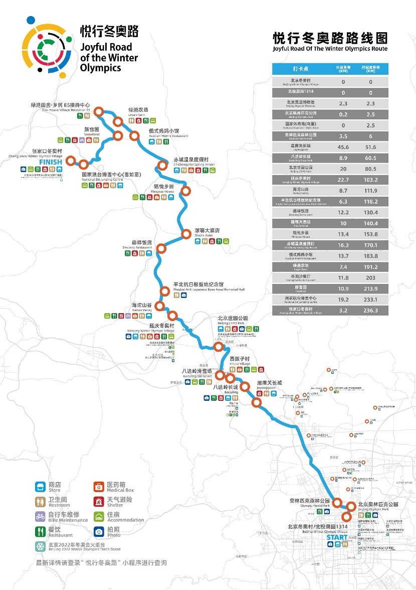 “悦行冬奥路”自助赛道以北京冬奥村为起点,以张家口冬奥村为终点,全长236.3千米,沿途共19个打卡服务点,3个特色打卡点,途经北京奥林匹克公园(北京奥运博物馆)、居庸关长城、八达岭长城、北京世园公园、延庆冬奥村、海陀山谷、新雪国度假区、国家跳台滑雪中心等京张两地部分冬奥核心区及沿线知名旅游景区。