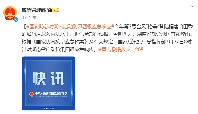根据《国家防汛抗旱应急预案》及有关规定,国家防汛抗旱总指挥部7月27日8时针对湖南省启动防汛四级应急响应。