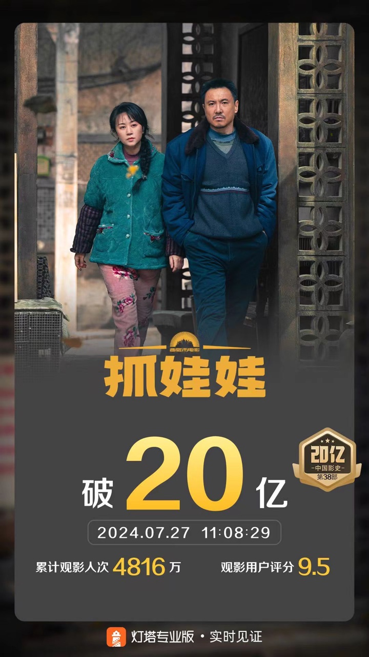 新京报讯(记者周慧晓婉)据灯塔专业版实时数据,截至7月27日11时8分29秒,影片《抓娃娃》上映12天,票房突破20亿,这也是沈腾、马丽继《羞羞的铁拳》《我和我的家乡》《独行月球》之后第四部合作电影票房突破20亿。