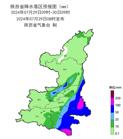 据央视新闻消息,7月28日8时至29日8时,陕北及关中局地、陕南中东部降中到大雨,陕南东部局地暴雨;陕西有57个县(区)降水,其中25~50毫米区县有11个,50~100毫米2个。