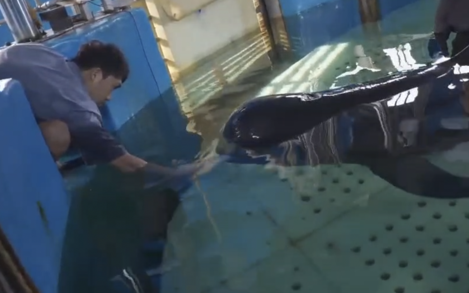不仅如此,当时海莉不能自主下潜和进食。志愿者们需要轮流值守,在水下托举短肢领航鲸,防止它突然侧翻溺水。日常进食要在兽医的帮助下灌食鱼浆、淡水等。