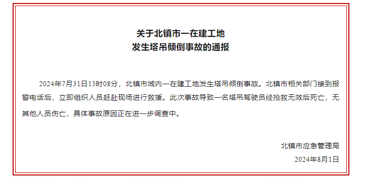 新京报讯 8月1日,辽宁北镇应急官微发布关于北镇市一在建工地发生塔吊倾倒事故的通报,全文如下: