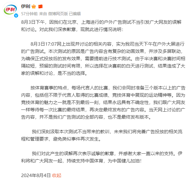 我们对此产生的误解再次表示诚挚的歉意,并感谢大家一直以来的支持。伊利将和广大网友一起,持续支持中国体育,为中国健儿加油!