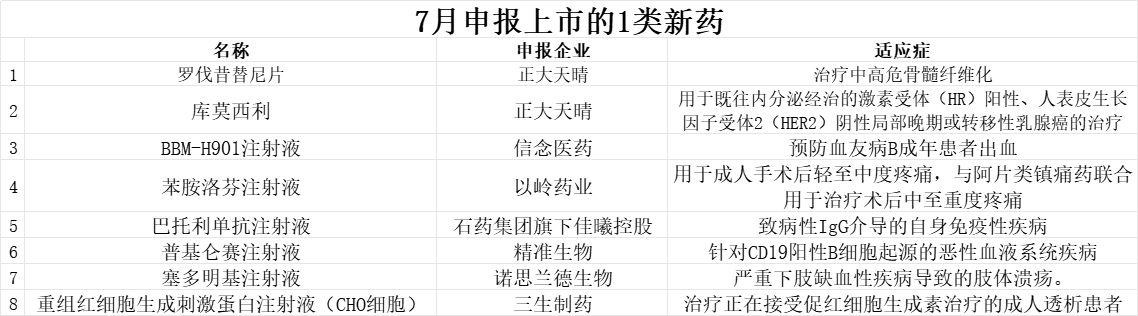 7月获批上市的1类新药为信立泰的苯甲酸福格列汀片。该药是一种二肽基肽酶4(DPP-4)抑制剂,用于改善成人2型糖尿病患者的血糖控制(包括单药治疗,以及单独使用盐酸二甲双胍不能有效控制血糖时的联合治疗)。